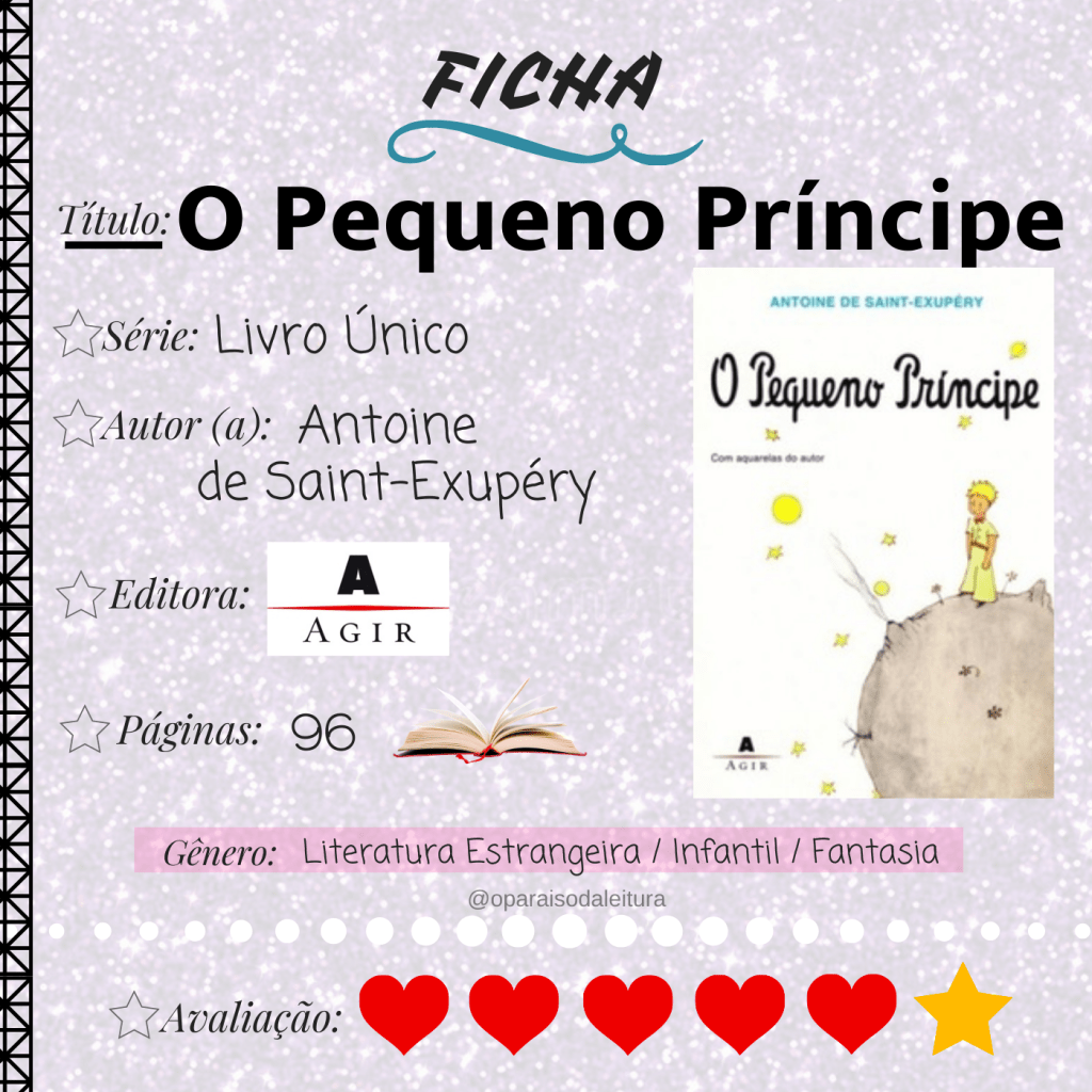 Um piloto de aviões se vê forçado a realizar um pouso de emergência no deserto do Saara, tendo poucos dias para consertar o motor de seu avião antes de faltar água, uma figura aparece para ele, o pequeno príncipe, lhe mostra as coisas simples da vida e o quanto as pessoas são mais essenciais que objetos. O Pequeno Príncipe é um livro infantil, mas eu não o vejo assim. O percebo como uma história para todas as idades, trazendo mensagens filosóficas, intrigantes e, ao mesmo tempo, tão acessíveis que fazem seu leitor refletir na maneira como leva a sua vida. Acredito que em cada idade, a qual este livro for lido, terá um impacto diferente!