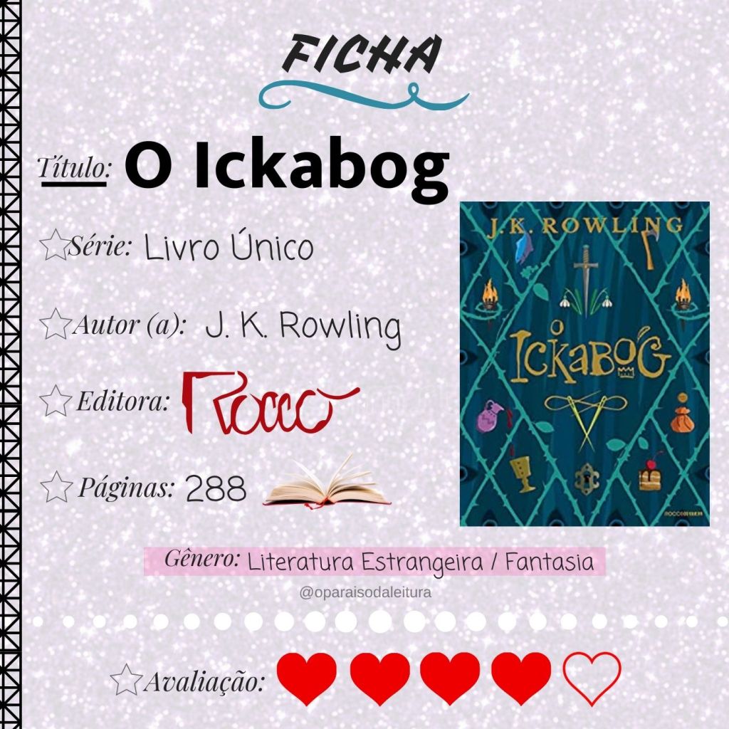 Sinopse: “Com a altura de dois cavalos, olhos que brilham como bolas de fogo, garras afiadas e compridas feito navalhas, o Ickabog está chegando. Um monstro mítico, um reino em perigo e uma aventura que irá testar a bravura de duas crianças. Descubra uma história brilhantemente original, divertida e irônica, sobre o poder da esperança e da amizade, de J.K. Rowling, autora de Harry Potter, uma das maiores contadoras de história de todos os tempos. O reino da Cornucópia já foi o mais feliz do mundo. Tinha muito ouro, um rei com os melhores bigodes que você poderia imaginar, e açougueiros, padeiros e queijeiros cujas comidas deliciosas faziam uma pessoa dançar de prazer. Tudo parecia perfeito, mas nos pântanos enevoados ao norte, segundo a lenda, vivia o monstruoso Ickabog. Qualquer pessoa sensata sabia que o Ickabog era apenas um mito para assustar as crianças e fazê-las se comportar. Mas quando esse mito ganha vida própria, lançando uma sombra sobre o reino, duas crianças – os melhores amigos Bert e Daisy – embarcam em uma grande aventura para desvendar a verdade, descobrir onde está o verdadeiro monstro e trazer a esperança e a felicidade de volta para Cornucópia. Em uma bela edição capa dura O Ickabog traz 34 ilustrações coloridas de crianças brasileiras de 7 a 12 anos de vários estados do Brasil, vencedoras do Concurso de Ilustração Ickabog.”