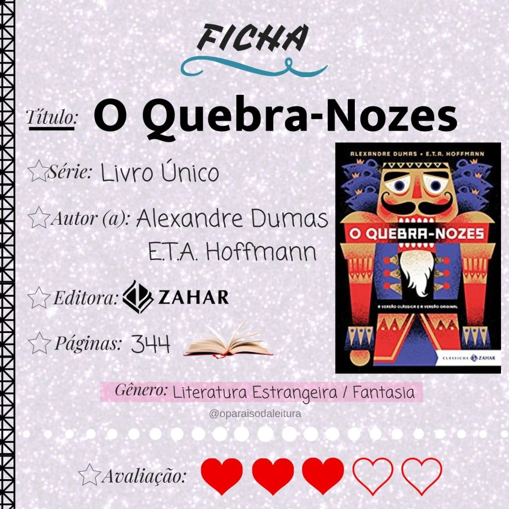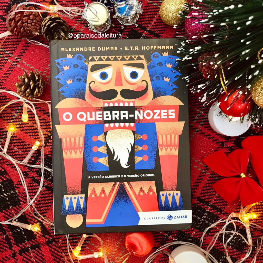 Sinopse: “É véspera de Natal. Marie se encanta, dentre todos os presentes, por um quebra-nozes em formato de boneco. Ela acomoda o novo amigo no armário de brinquedos – mas, à meia-noite, ouve estranhos ruídos. Aterrorizada, vê seu padrinho, o inventor Drosselmeier, sinistramente acocorado sobre o relógio de parede, e um exército de camundongos invadindo a sala, comandado por um rei de sete cabeças! Contra eles, os brinquedos saem do armário e põem-se em formação. Têm uma grande batalha pela frente, sob as ordens do Quebra-Nozes… Entre o sonho e a realidade, Marie viverá histórias maravilhosas e estranhas, de reinos, feitiços e delícias. Histórias em que o inusitado padrinho tem um papel especial, e nas quais só pode embarcar quem tem os olhos e o coração preparados. Você tem? Esta edição inclui as duas variantes da história: a versão original de E.T.A. Hoffmann e a clássica de Alexandre Dumas – que popularizou a história e inspirou o famoso balé de Tchaikovsky –, com tradução de André Telles (do francês) e Luís S. Krausz (do alemão). Traz ainda apresentação da pesquisadora e especialista em contos de fadas Priscila Mana Vaz e mais de 200 ilustrações de época.”