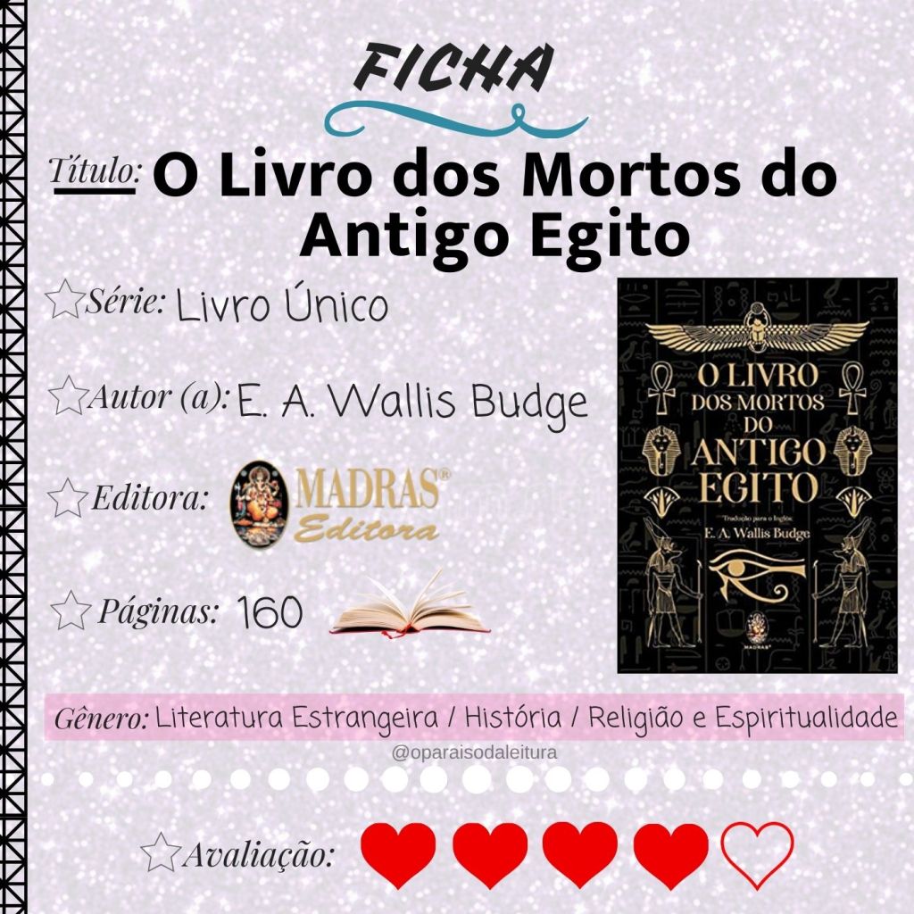 Sinopse: “Misterioso, poderoso e comovente, o livro dos mortos do antigo egito é um dos textos mais antigos e mais influentes de toda a história. É composto de uma combinação de orações, feitiços e discursos que os antigos egípcios enterravam com seus mortos, com o objetivo de ajudar os falecidos em sua jornada para a vida após a morte. Esta edição contém imagens do requintado papiro de ani – um antigo escriba egípcio – em sua totalidade. Meticulosamente inscrito com hieróglifos e ilustrações dos rituais da vida após a morte, o papiro é mostrado com tradução do aclamado egiptólogo E. A. Wallis Budge. O livro dos mortos do antigo egito é o livro da vida. Fala, na verdade, sobre a vida agora, a vida no futuro e a vida eterna. As estradas, os caminhos, os portais, as horas, as leis e os guardiões da vida após a morte aqui são explicados em detalhes. Este é o único registro vivo de um mistério duplo: o mistério da vida e o mistério da morte.