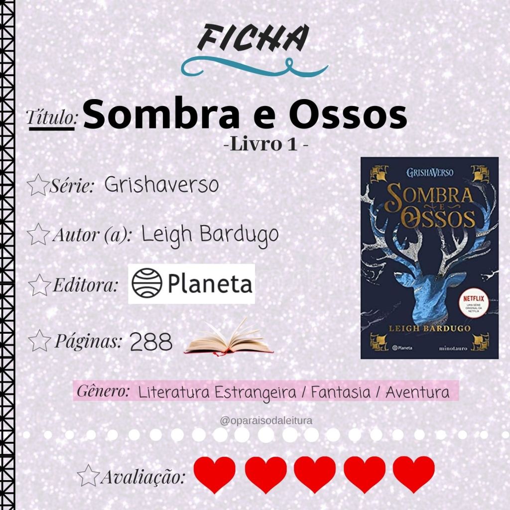 Interessante como o contexto aborda vários momentos gostosos de serem lidos, desde as descobertas da protagonistas, até seu treinamento, sua vida em meio ao luxo e se percebendo uma jovem com poderes extraordinários! Junto de Maly, seu amigo de infância, e Darkling que surge após os poderes da jovem virem à tona.