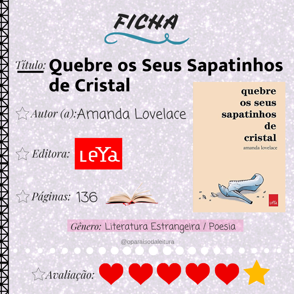 Sinopse: “A autora dá uma nova e moderna interpretação à versão tradicional da história da Cinderela e fala de como não devemos dar ouvidos àqueles que não veem o nosso valor, mesmo que, às vezes, essa pessoa sejamos nós mesmas. Os poemas deste livro abordam temas contemporâneos como autoaceitação, relacionamentos tóxicos, assédio sexual, transtornos alimentares, mas falam principalmente de dar a volta por cima e de perceber que somos a personagem mais importante da nossa história e podemos construir o nosso próprio final feliz. Com seus versos simples e diretos, que já arrebataram milhares de fãs em todo o mundo, Amanda Lovelace se dirige às mulheres, questionando e transformando papéis que fazem parte do imaginário feminino há muitas gerações, como o do príncipe encantado, com o qual viveremos felizes para sempre, e o da fada madrinha, que nos concederá todos os nossos desejos.”