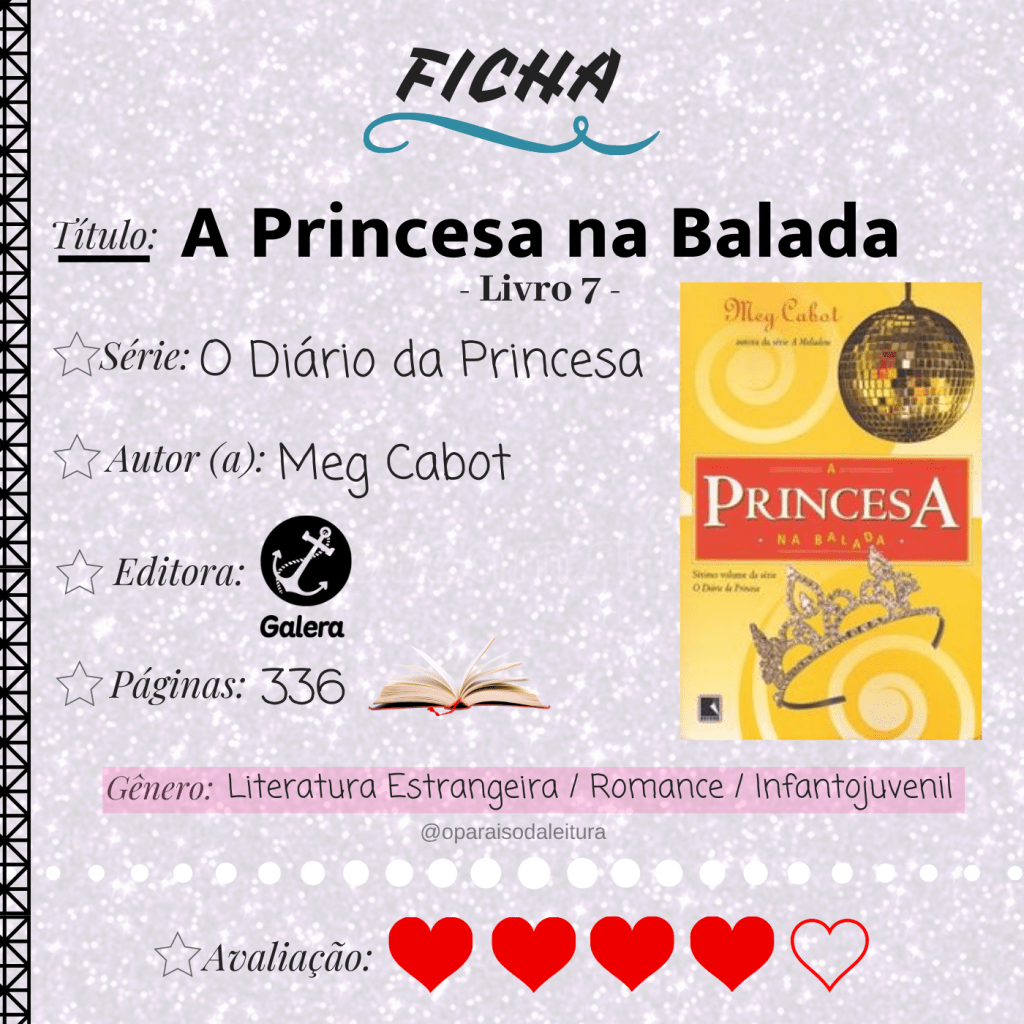 Sinopse: “As princesas só querem se divertir. Basta ler Princesa na balada, sétimo volume da série O Diário da Princesa ― que deu origem à superprodução dos Estúdios Disney estrelada por Julie Andrews e Anne Hathaway e um dos lançamentos mais vendidos pela Editora Record ―, para ter absoluta certeza disso.Nesta primavera, Mia está decidida a se divertir, apesar de o governo estudantil de que ela é presidente de repente se encontrar falido. Por sorte (ou por azar, dependendo do ponto de vista), Grandmère tem um plano elaborado para arrecadar fundos, catapultar Mia à fama teatral e, ao mesmo tempo, promover uma união romântica entre ela e um partidão, que não é o namorado dela. Não é para menos que Michael, o amor da vida da menina, parece achar que ela é louca ou, pior ainda, nada divertida.Será possível que Mia, prestes a se tornar uma estrela dos palcos, presidente do governo estudantil e futura governante da Genovia, não está pronta para festas? A trama está ainda mais deliciosa e divertida, repleta de referências à cultura pop americana. Princesa na balada é a nova aventura da personagem que continua cativando adolescentes do mundo inteiro.”