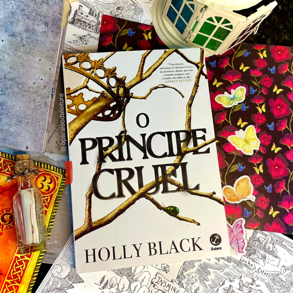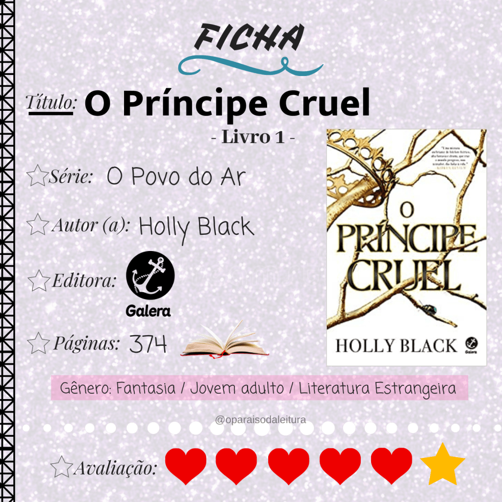 Sinopse: “Primeiro livro da mais nova série de Holly Black. Conheça a impressionante história de uma garota mortal que se vê presa em uma teia de intrigas reais. Jude tinha 7 anos quando seus pais foram assassinados e foi forçada a viver no Reino das Fadas. Dez anos depois, tudo o que ela quer é ser como eles – lindos e imortais – e realmente pertencer ao Reino das Fadas, apesar de sua mortalidade. Mas muitos do povo das Fadas desprezam os humanos. Especialmente o Príncipe Cardan, o filho mais jovem, mais bonito e mais cruel do Grande Rei. Para ganhar um lugar na Alta Corte, ela deve desafiá-lo… e enfrentar as consequências. Envolvida em intrigas e traições do palácio, Jude descobre sua própria capacidade para truques e derramamento de sangue. Mas, com a ameaça de uma guerra civil e o Reino das Fadas por um fio, Jude precisará arriscar sua vida em uma perigosa aliança para salvar suas irmãs, e o próprio Reino. Com personagens únicos, reviravoltas inesperadas, e uma traição de tirar o fôlego, este livro vai deixar o leitor pedindo bis – querendo mergulhar de cabeça na continuação deste universo.”