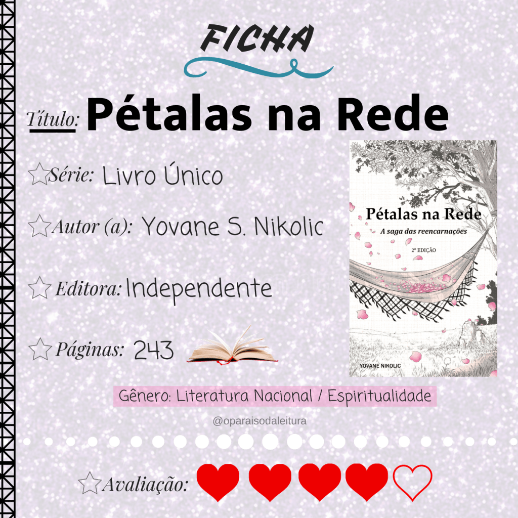 Pétalas na Rede traz uma história espiritual e conceitos de reencarnação dentro da mesma linha familiar, destacando consequências das escolhas de cada um, principalmente quando alguém se envolve com drogas. Bem interessante perceber as conexões e os aprendizados na vida de cada personagem!
