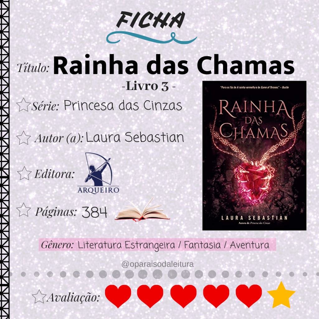 Sinopse: “A princesa Theodosia foi prisioneira em seu próprio país por mais de uma década, humilhada pelo kaiser e por sua corte. Porém, mesmo usando uma coroa de cinzas, o fogo nunca deixou seu sangue. Como herdeira legítima do trono de Astrea, Theo sabe que uma rainha não se acovarda jamais. Agora livre e com um exército rebelde sob seu comando, Theodosia tem que libertar o povo escravizado por uma inimiga ainda mais assustadora: Cress, a nova kaiserin. Munida de um tipo de magia nunca visto antes, a adversária está disposta a queimar todos que ficarem no caminho do seu império. Theo precisa abraçar seu novo poder como Rainha das Chamas se quiser derrotar Cress, a mulher a quem um dia chamou de irmã do coração.”