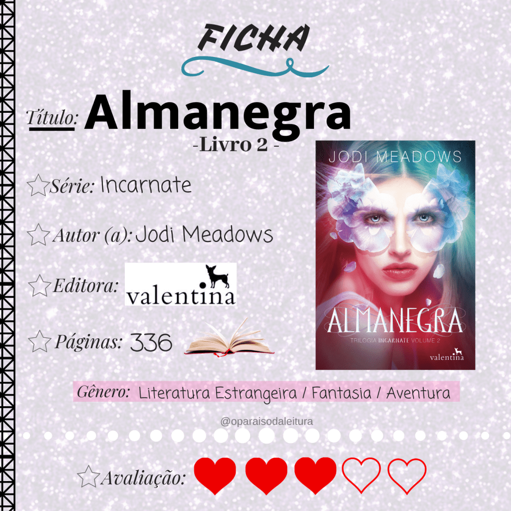 Sinopse: “ALMANEGRA Ana sempre foi a única. Marginalizada. Apartada. E, para piorar, após o Escurecimento do Templo causado por seu pai, vários cidadãos de Heart a culpam pela perda definitiva de algumas almas, as almasnegras ― e pelas almasnovas que nascerão em seu lugar. SOMBRAS Muitos temem a presença de Ana, um lembrete constante das mudanças irreversíveis. E quando as sílfides começam a se comportar de maneira diferente em relação a ela, Ana terá que aprender não apenas a se defender como àqueles que não podem fazer isso por si mesmos. AMOR Ana aprendeu desde cedo que os sem-alma não podem amar. Mas, e as almasnovas? Mais do que tudo, ela deseja ter a chance de viver e amar como qualquer outro cidadão de Heart, porém mesmo depois de Sam declarar seus mais profundos sentimentos, será que ela conseguirá superar uma vida inteira de rejeição e aceitar o amor? Almanegra explora a beleza e as profundezas sombrias da alma, numa história que é ao mesmo tempo um romance épico e uma fantasia cativante.”