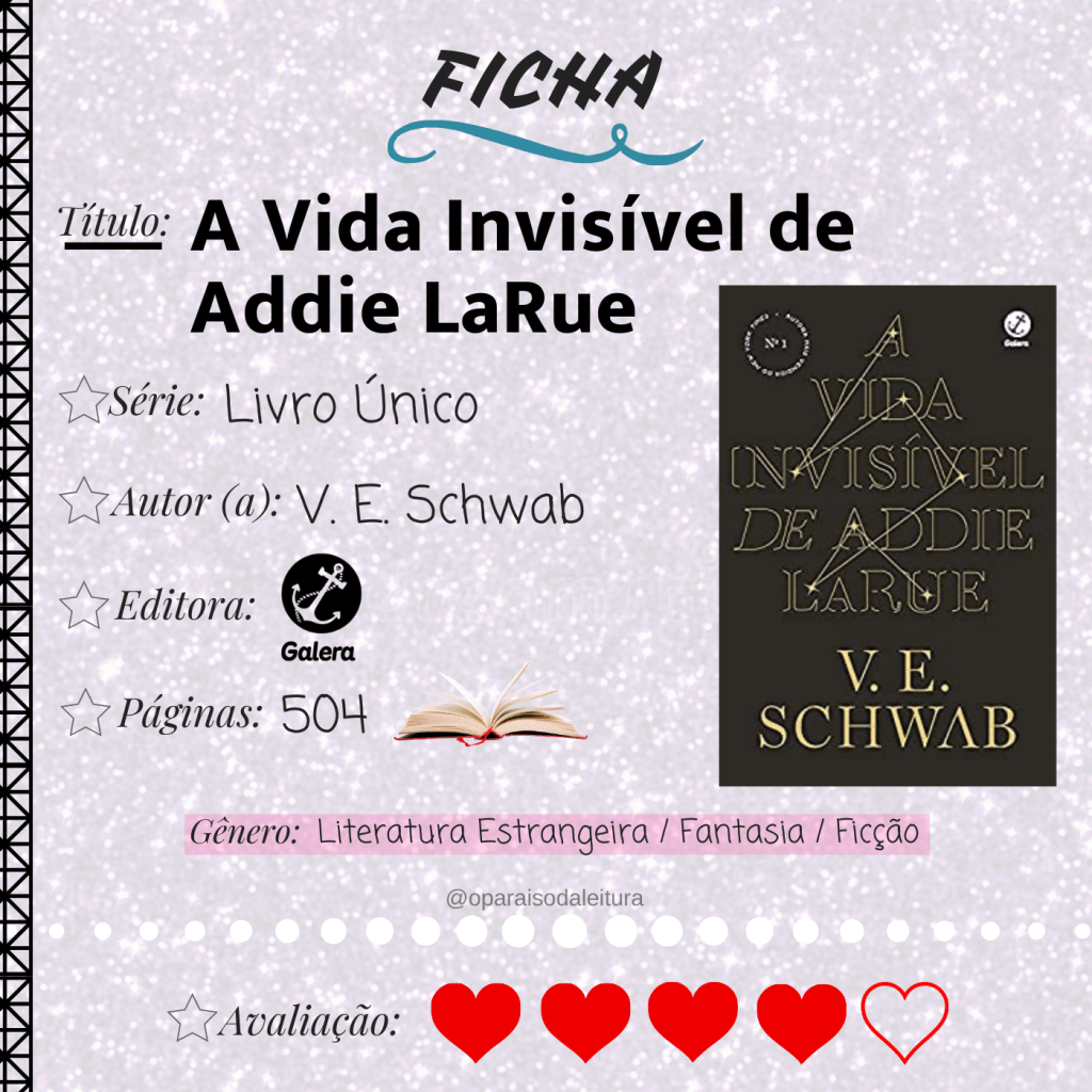 Em A vida invisível de Addie LaRue, o aguardado best-seller de V.E. Schwab, conheça Addie e se perca em sua vida invisível — porém memorável. França: 1714. Addie LaRue não queria pertercer a ninguém ou a lugar nenhum. Em um momento de desespero, a jovem faz um pacto: a vida eterna, sob a condição de ser esquecida por quem a conhecer. Um piscar de olhos, e, como um sopro, Addie se vai. Uma virada de costas, e sua existência se dissipa na memória de todos.