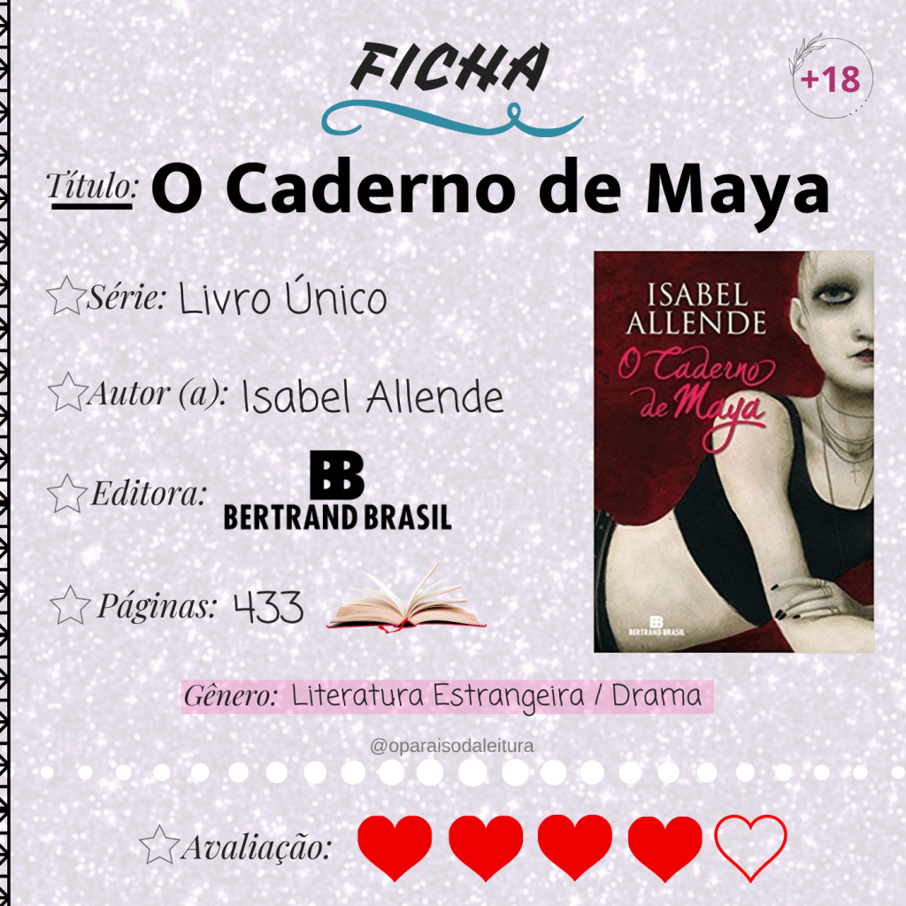 Sinopse: “O Caderno de Maya, diferentemente dos tradicionais romances de Isabel Allende, é passado nos dias atuais. Apresenta a trama de uma garota americana de 19 anos que encontrou refúgio em uma ilha remota da costa do Chile, depois de cair em uma vida de drogas, crime e prostituição.