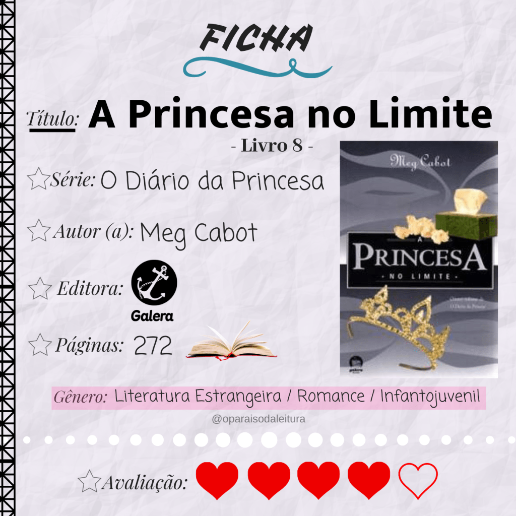 Sinopse: “Desta vez, tudo parece estar bem para Mia: conseguiu passar de ano e se livrou da responsabilidade de ser a presidente do conselho estudantil. Mas rapidamente ela percebe que o ano está longe de ser cor-de-rosa… A professora de Inglês a inscreveu na matéria de Introdução à Escrita Criativa, e todo mundo sabe que a Princesa da Genóvia quer mesmo é ser uma grande escritora no futuro — será que a sra. Martinez não vê que ela já sabe tudo sobre criatividade?