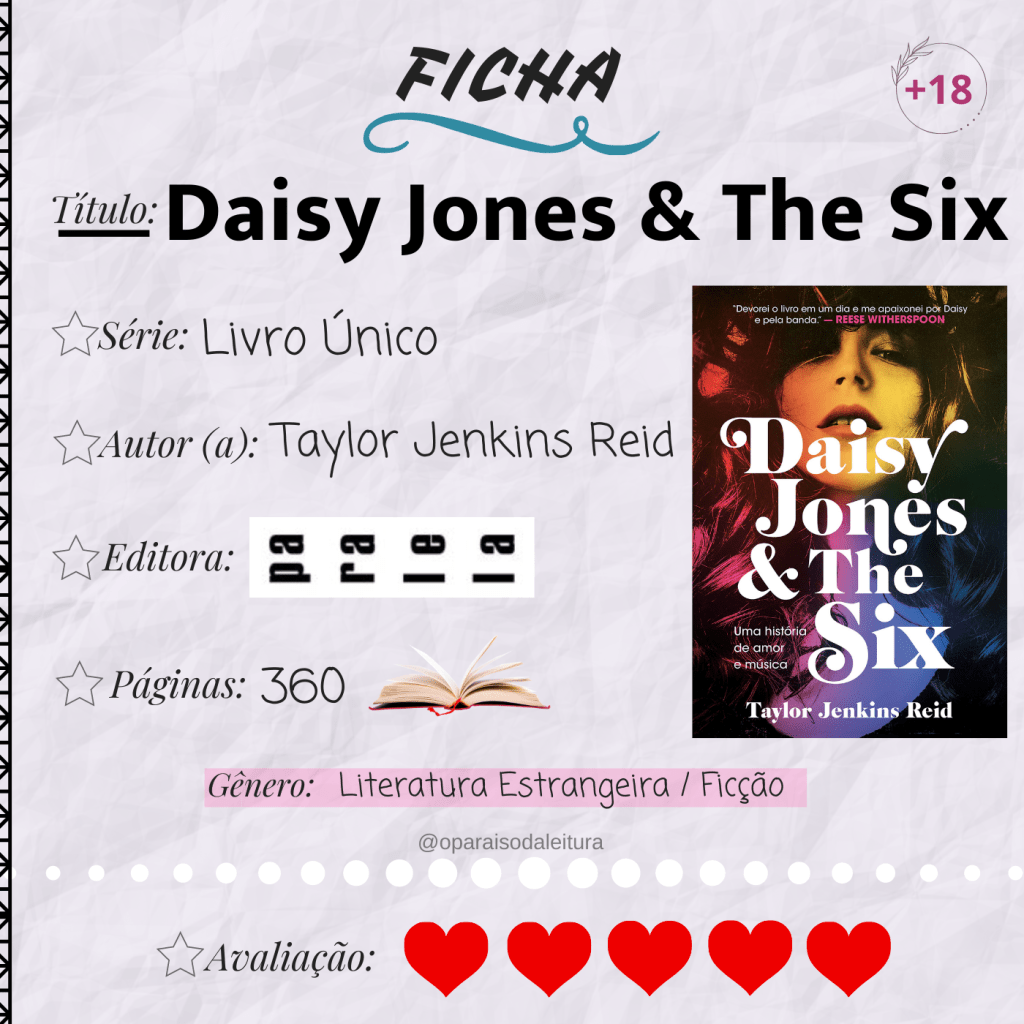 Sinopse: “Todo mundo conhece Daisy Jones & The Six. Nos anos setenta, dominavam as paradas de sucesso, faziam shows para plateias lotadas e conquistavam milhões de fãs. Eram a voz de uma geração, e Daisy, a inspiração de toda garota descolada. Mas no dia 12 de julho de 1979, no último show da turnê Aurora, eles se separaram. E ninguém nunca soube por quê. Até agora.