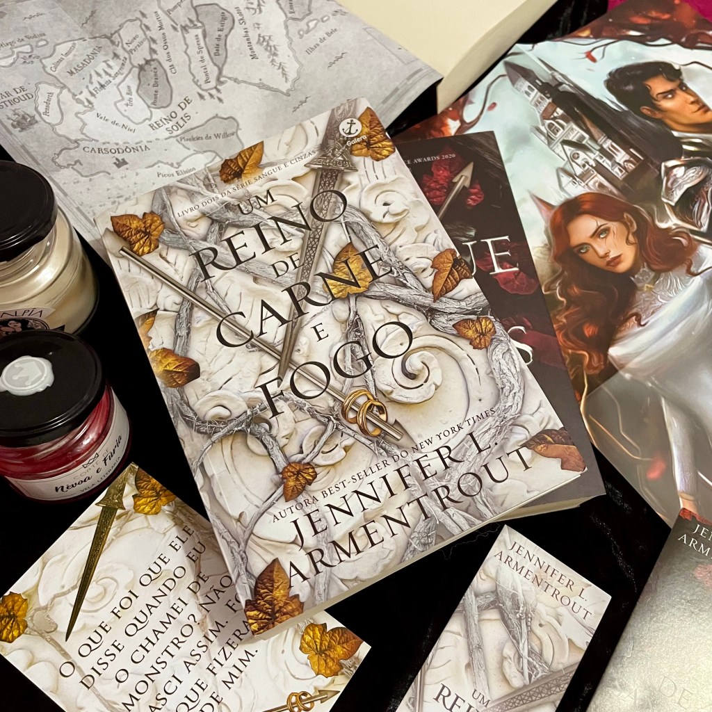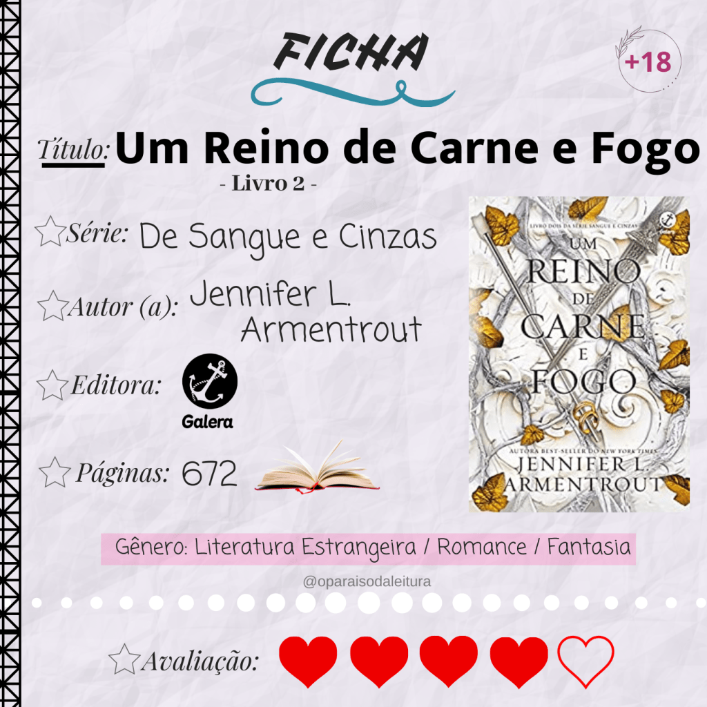 Sinopse: “A vida inteira de Poppy se revelou uma mentira. Do homem que acreditou amar ao papel que ocupava em um reino decadente, tudo não passava de uma farsa. A liberdade que a jovem sonhava em seus dias de Donzela não se concretizou mesmo com a queda do véu. E tudo o que Poppy conquistou foi o ódio do povo de Atlântia e um noivado com seu maior inimigo, o Príncipe das Trevas. Casteel Da’Neer é um homem de muitos nomes e muitos disfarces. Suas mentiras são tão sedutoras quanto o seu toque. Suas verdades tão sensuais quanto a sua raiva. Poppy se tornou uma mera peça de xadrez do tabuleiro do príncipe e sabe que não pode confiar nele, mas o noivado com Casteel é a única maneira de descobrir o paradeiro de seu irmão e entender se ele se transformou em um Ascendido inescrupuloso. Unidos em um casamento de conveniência, o casal tem muitos desafios pela frente. Precisam convencer dois reinos partidos da legitimidade da união e evitar uma guerra. Mas trabalhar lado a lado com o inimigo apresenta riscos perigosos demais, e voltar a se apaixonar por Casteel é um deles. Em Um reino de carne e fogo, as traições cortam mais fundo do que a lâmina e a paixão arde mais quente do que o fogo. Mas será o amor mais forte do que a vingança?”