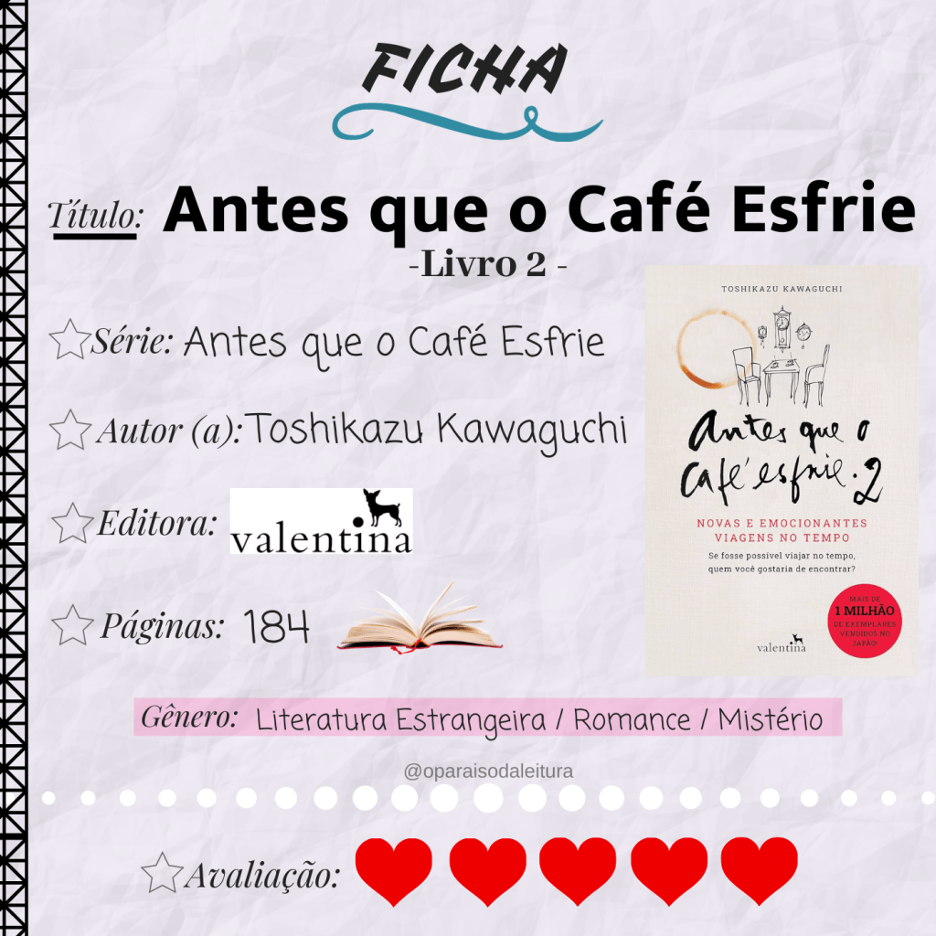 Sinopse: “Em uma ruazinha estreita e silenciosa de Tóquio, num subsolo, existe um estabelecimento que, há mais de 100 anos, serve um café cuidadosamente preparado. Além disso, uma estranha lenda urbana conta que os clientes podem viver ali uma experiência única: fazer uma viagem no tempo. Em Antes que o Café Esfrie 2: Novas e emocionantes viagens no tempo, conheceremos quatro pessoas que precisam viver essa experiência. Nesta bela e reveladora continuação, conheceremos homens e mulheres que buscam não só a felicidade que outrora já haviam experimentado, mas um sentido para a vida. São histórias que nos aquecem o coração e exploram a maneira como carregamos no colo nosso passado como um pesado fardo, e o quão longe devemos ir para reencontrar – quem sabe pela última vez – aqueles que amamos.”