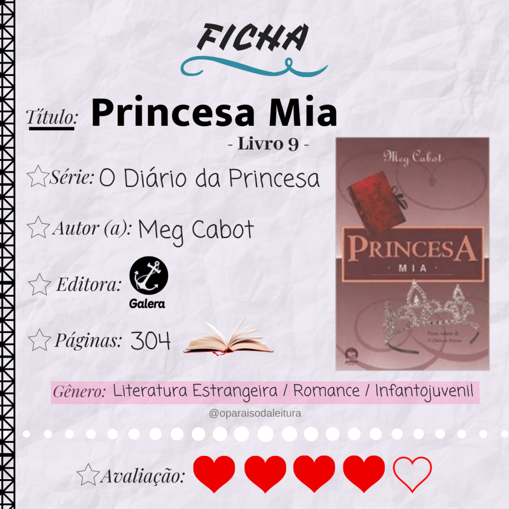 É incrível a maneira como a princesa se posiciona com a ajuda de seu psicólogo. Quanto aos outros acontecimentos, achei bem interessante o fato de Mia perceber ainda mais o quanto a amizade com Lili não estava lhe fazendo bem (algo que venho reparando nos livros anteriores e destacando em minhas resenhas). Além de a própria protagonista dar mais vazão ao que importa para ela e dando relevância aos seus valores!