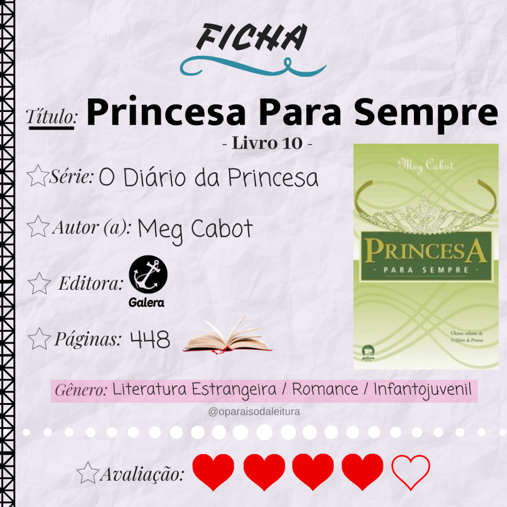 Sinopse: “Aguardado décimo e último volume da série Os Diários da Princesa, PRINCESA PARA SEMPRE encerra as aventuras da princesa Mia Thermopolis, que deram origem a um filme blockbuster da Disney e conquistaram mais de 15 milhões de leitores ao redor do mundo. A série confirmou Meg Cabot como a rainha pop das adolescentes, com mais de 800 mil livros vendidos no Brasil. Em PRINCESA PARA SEMPRE, encontramos Mia com saudades do seu diário… Afinal, depois de quase dois anos escrevendo seu trabalho de conclusão do ensino médio ― o que ocupava absolutamente todo o seu tempo ―, nossa princesa precisava mais do que nunca do que “consultor sentimental”. Para variar, ela está em apuros. Depois que Mia descobriu um documento histórico que transformava Genovia em uma democracia, seu pai precisa enfrentar a primeira eleição do principado. Infelizmente, seu primo, o príncipe Renné, resolveu que vai disputar o cargo de primeiro-ministro com ele… E sua plataforma é baseada em cadeias multinacionais de fast-food e na exploração do turismo de massa. Mia está quase arrependida de ter achado o tal documento!Mas esse não é o único problema da princesa (é claro). Mia entrou numa espiral de medo, terror, pavor… e mentiras. A maior delas é que seu trabalho de conclusão foi uma tese sobre a extração do azeite de oliva na Genovia, quando, na verdade, é um livro romântico ambientado na Inglaterra medieval. Afinal, Mia não quer que ninguém peça para ler seu “trabalho”, apesar de ter enviado o original para várias editoras sob o pseudônimo de Dafne Delacroix. Infelizmente, nenhuma delas quer publicá-lo…Para piorar, Michael está de volta à Nova York. Depois de dois longos anos no Japão, o ex-namorado da princesa ganhou fama e fortuna graças ao braço robótico que inventou. Mia tem certeza que isso não vai fazer a menor diferença no seu namoro com J.P., considerando como ele é fofo, bonito e, enfim, perfeito. Mas, com tudo o que Mia anda inventando por aí, será que podemos confiar nela a respeito disso também?PRINCESA PARA SEMPRE é o esperado décimo volume da série O Diário da Princesa. Os milhões de leitores da série em todo o mundo finalmente vão descobrir, no último volume das aventuras de Mia, qual final feliz espera uma das princesas mais amadas da literatura.”