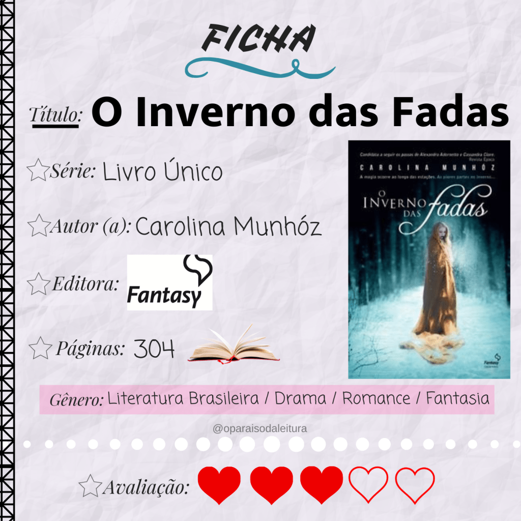 Sinopse: “Sophia Coldheart não é uma fada comum. Ela é uma Leanan Sídhe, uma espécie de fada que serve de musa para humanos talentosos alcançarem o sucesso. Uma fada-amante. Mas isso tem um preço. Ao mesmo tempo em que os leva ao estrelato, se alimenta de suas energias, levando-os à loucura. E à morte. Uma vida intensa e extraordinária com um fim trágico. Mas o que aconteceria se um humano resistisse à sua sedução e fizesse a própria Sophia sentir-se fascinada por ele? A autora Carolina Munhóz nos conta essa história com primazia, mostrando que o mundo da fantasia para jovens ainda pode render sucessos e obras que vão muito além do simples passar de tempo.”