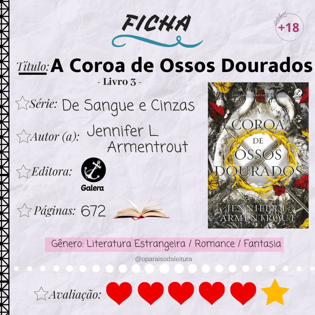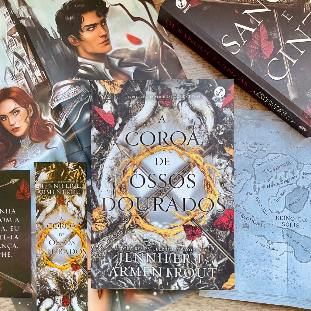 Sinopse: “Em A coroa de ossos dourados as consequências das ações de Poppy provocam revelações chocantes para ela, Casteel e todo o reino de Atlântia. Depois de explorar habilidades até então desconhecidas, Poppy descobriu que sua origem vai muito além do que poderia imaginar, assim como seu poder. Quando a semente da traição germina, ela percebe que o mal não foi vencido, e que aliados e inimigos se confundem por trás das já conhecidas máscaras dos Descendidos. Mas não exatamente. Uma facção secreta se ergue em nome de Atlântia, unindo-se aos Ascendidos contra Poppy e tudo o que ela representa. Numa reviravolta extraordinária, medidas desesperadas transformam heróis em vilões quando uma perigosa Ascensão é descoberta. As tentativas de evitar a guerra contra Solis leva Poppy e os Atlantes em uma jornada nunca antes realizada, e as consequências serão inimagináveis. Mas quando novas ameaças se revelam, eles percebem que também precisam de novos aliados ― mesmo o mais improvável e perigoso deles.”
