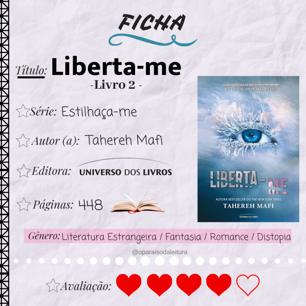 Sinopse: “Após escapar do Restabelecimento e encontrar a sede da resistência rebelde – um lugar para pessoas com dons, como ela –, Juliette enfim se sente livre… livre do plano de ser usada como arma e livre para amar. Mas ela nunca estará livre de seu toque letal. Nem da guerra que se aproxima. Assombrada pelo passado e aterrorizada com o futuro, ela sabe que precisa tomar decisões capazes de mudar sua vida, entre o que quer e o que acredita ser correto. Decisões que podem envolver escolhas entre seu coração e a vida de alguém.”