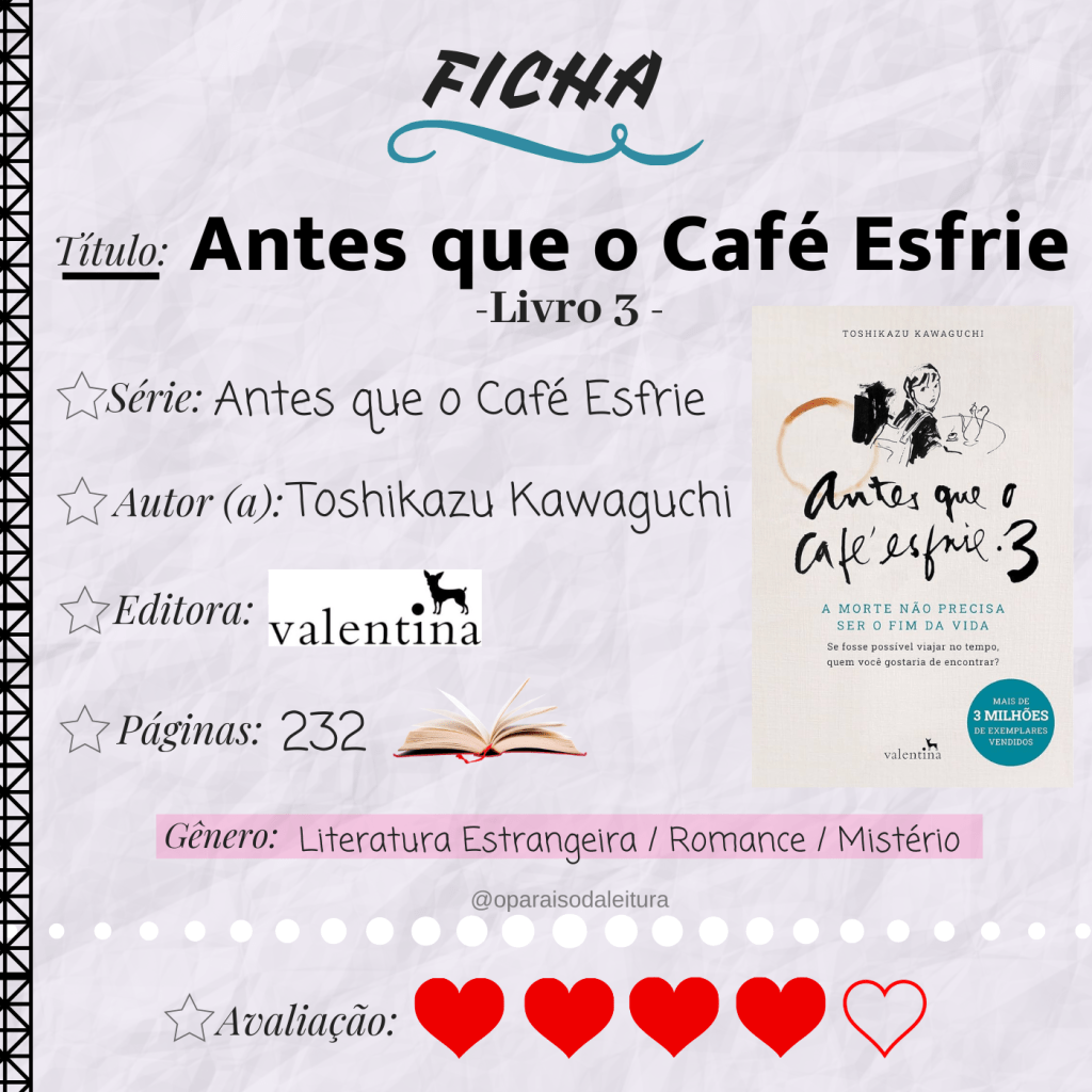 Sinopse: ““Com cada história se aprende o significado do tempo, o tempo perdido, o tempo soberano, a falta de tempo, o tempo que não deu tempo, o tempo que passou e não volta mais, o tempo do que ainda está por vir…” Aos pés do Monte Hakodate, no norte do Japão, bem no meio de uma ladeira, existe um estabelecimento – assim como o Funiculì Funiculà de Tóquio – onde, apesar das irritantes regras, é possível viajar no tempo. No Café Donna Donna, vamos reencontrar Nagare e Kazu, e conhecer sua adorável filha Sachi, de sete anos. Em Antes que o Café Esfrie 3 – a morte não precisa ser o fim da vida, conheceremos quatro pessoas que precisam viver essa experiência. Nesta pungente e acolhedora continuação, além de novos e encantadores personagens, seremos apresentados a um enigmático livro: O que você faria hoje se o mundo acabasse amanhã?: 100 perguntas. Para que viajar no tempo se o presente não muda? Essa, seguirá martelando a cabeça dos leitores.”