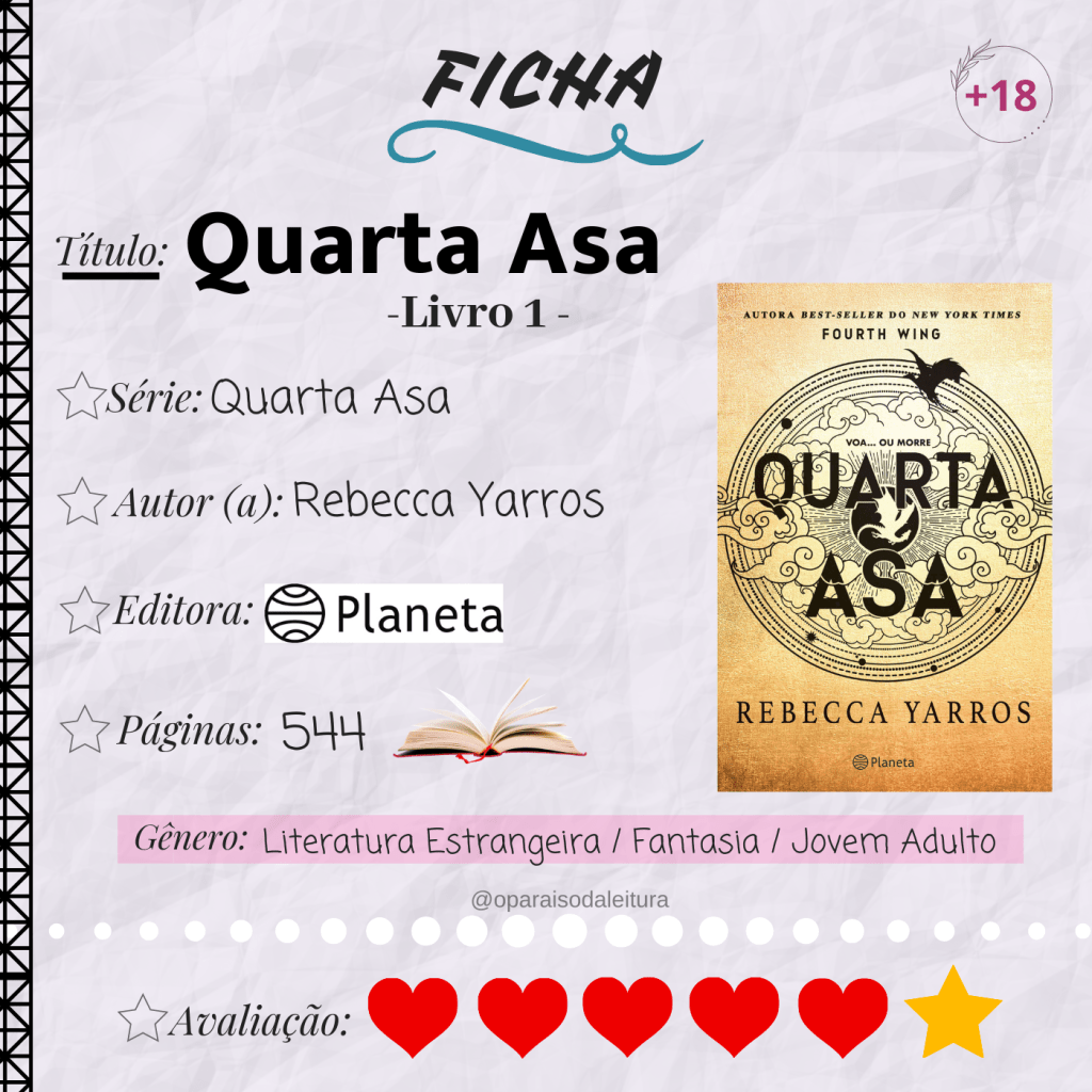 Sinopse: “Violet Sorrengail, uma jovem de vinte anos, estava destinada a entrar na Divisão dos Escribas, levando uma vida relativamente tranquila entre os livros e as aulas de História. No entanto, a general comandante das forças de Navarre – também conhecida como sua mãe –, durona como as garras de um dragão, ordena que Violet se junte às centenas de candidatos que buscam se tornar a elite de seu país: cavaleiros de dragões. O problema é que, quando você é menor que todos os demais candidatos e certamente mais frágil que eles, a morte está a apenas uma batida de coração de distância… Porque os dragões não se unem a humanos “frágeis”. Eles os reduzem a cinzas. Todos no Instituto Militar Basgiath têm um objetivo. Com menos dragões disponíveis que cadetes, a maioria estaria disposta a matar Violet para aumentar suas próprias chances de sucesso. O restante a mataria apenas por ser filha de quem é – e um bom exemplo disso parece ser Xaden Riorson, o líder de esquadrão mais poderoso e implacável na Divisão dos Cavaleiros. Entre amigos, inimigos e amantes, Violet precisará contar com sua inteligência se quiser sobreviver. Mas as proteções do reino estão falhando e a cada dia que passa a guerra se torna mais mortal. E o pior: Violet começa a suspeitar que a liderança está escondendo um terrível segredo.”