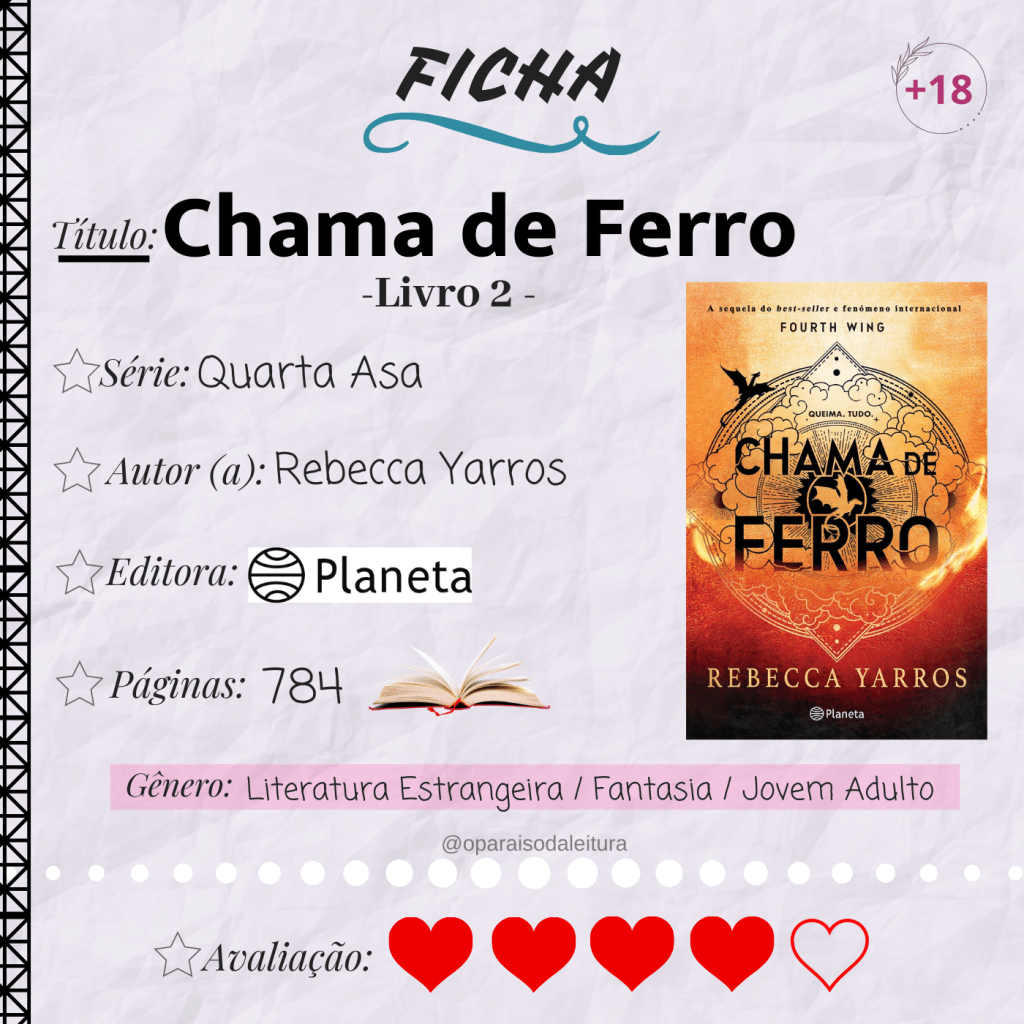 Sinopse: “Todos esperavam que Violet Sorrengail morresse durante seu primeiro ano no Instituto Militar Basgiath… inclusive ela própria. Mas a Ceifa foi apenas o primeiro teste, cujo objetivo maior era eliminar os mais fracos, os considerados indignos e os mais azarados. No entanto, agora começa o verdadeiro treinamento, e Violet já se pergunta como – e se – vai conseguir sobreviver. Não apenas porque o processo é extremamente exaustivo e repleto de armadilhas, ou porque cada etapa é projetada para levar os novos cavaleiros aos limites da dor e do sofrimento, mas por causa do novo vice-comandante, que parece ter como missão pessoal convencer Violet de que ela jamais será capaz de controlar suas habilidades extraordinárias… a menos que traia o homem que ama. Embora o corpo de Violet seja mais fraco e frágil do que o de todos os demais cavaleiros, ela pode contar com sua inteligência, além de uma determinação de ferro. E ela ainda se lembra da lição mais importante que Basgiath lhe ensinou: cavaleiros de dragão fazem suas próprias regras. Mas inteligência, determinação e força de vontade não serão suficientes esse ano, já que Violet descobrirá um segredo escondido por séculos, e nada, nem mesmo o mais poderoso fogo de dragão, pode ser suficiente para salvá-los no final.“