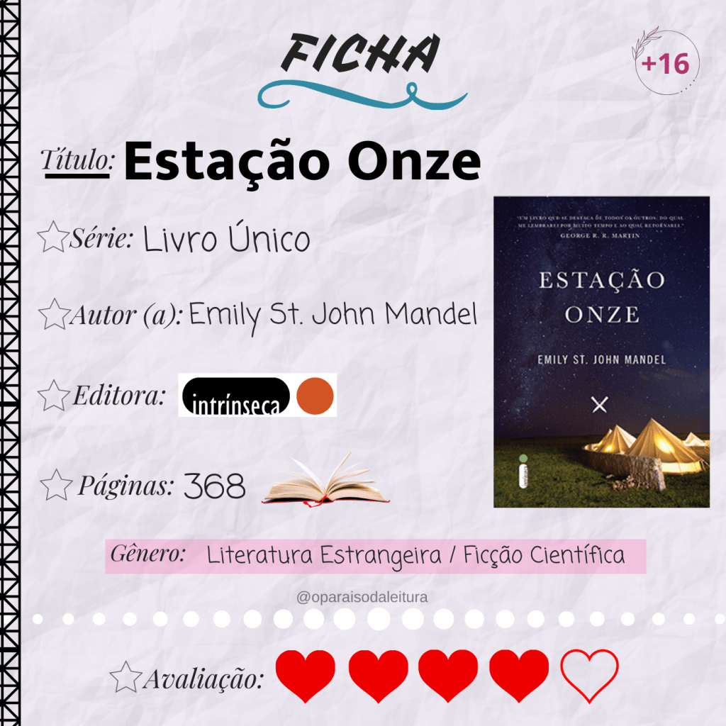 Sinopse: “Certa noite, o famoso ator Arthur Leander tem um ataque cardíaco no palco, durante a apresentação de Rei Lear. Jeevan Chaudhary, um paparazzo com treinamento em primeiros socorros, está na plateia e vai em seu auxílio. A atriz mirim Kirsten Raymonde observa horrorizada a tentativa de ressuscitação cardiopulmonar enquanto as cortinas se fecham, mas o ator já está morto. Nessa mesma noite, enquanto Jeevan volta para casa, uma terrível gripe começa a se espalhar. Os hospitais estão lotados, e pela janela do apartamento em que se refugiou com o irmão, Jeevan vê os carros bloquearem a estrada, tiros serem disparados e a vida se desintegrar. Quase vinte anos depois, Kirsten é uma atriz na Sinfonia Itinerante. Com a pequena trupe de artistas, ela viaja pelos assentamentos do mundo pós-calamidade, apresentando peças de Shakespeare e números musicais para as comunidades de sobreviventes. Abarcando décadas, a narrativa vai e volta no tempo para descrever a vida antes e depois da pandemia. Enquanto Arthur se apaixona e desapaixona, enquanto Jeevan ouve os locutores dizerem boa-noite pela última vez e enquanto Kirsten é enredada por um suposto profeta, as reviravoltas do destino conectarão todos eles. Impressionante, único e comovente, Estação Onze reflete sobre arte, fama e efemeridade, e sobre como os relacionamentos nos ajudam a superar tudo, até mesmo o fim do mundo.“
