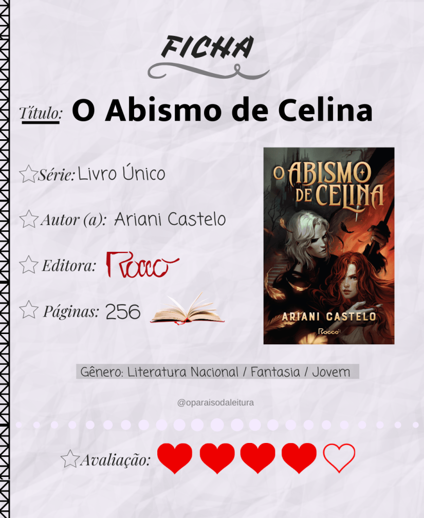 Rápida e envolvente, a leitura gera curiosidade constante em descobrir o que acontecerá com Celina nesse Abismo misterioso. Ao longo das páginas, a protagonista faz amizade com Kaira, com quem compartilha confidências. Juntas, enfrentam um jogo que exige tanto resistência física quanto psicológica, que só a própria Morte é capaz de gostar. Para sua surpresa, Celina acaba se aproximando mais do que gostaria daquele que governa o Abismo, uma figura que chega a nos convencer de não ser tão cruel assim. Essa relação, aos poucos, parece colocá-la em vantagem diante dos demais participantes.