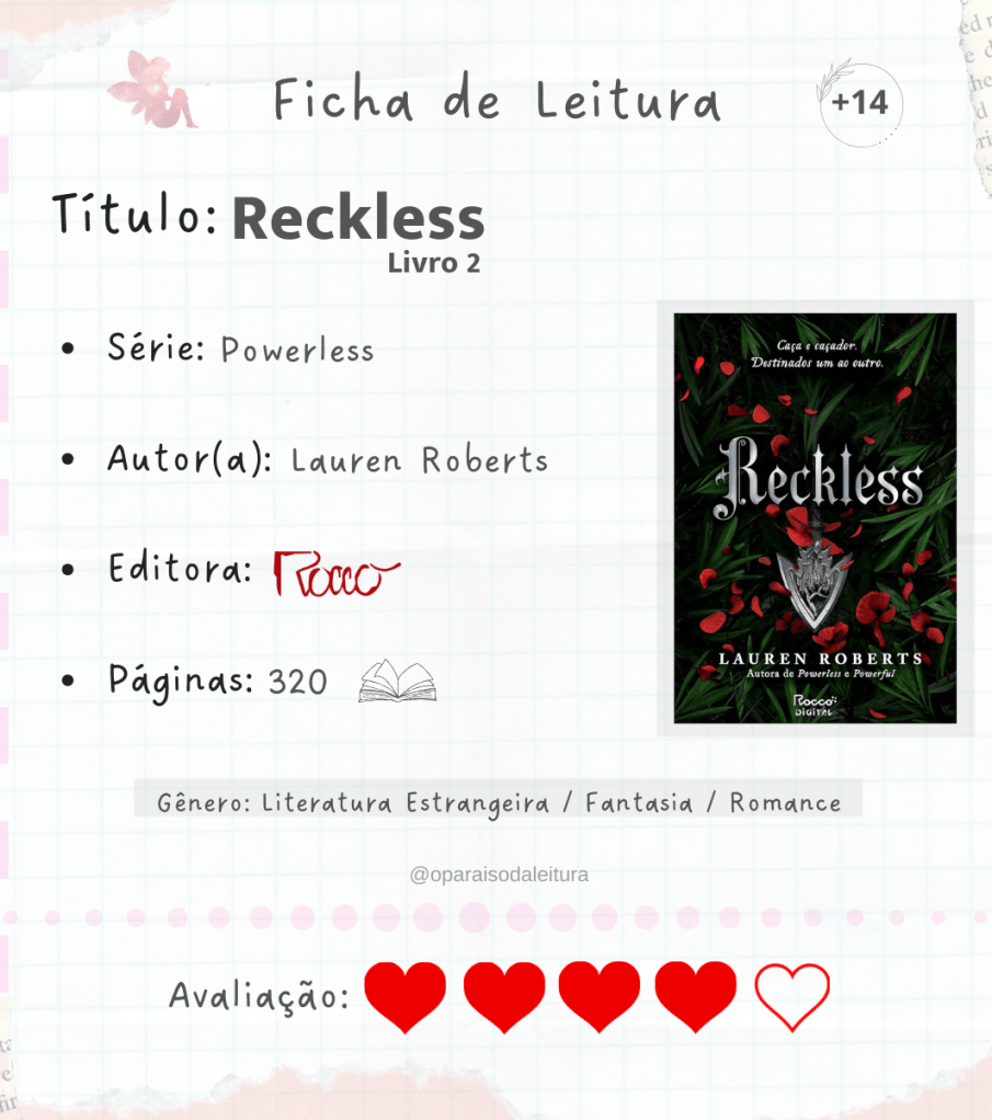 Sinopse: “Após o final arrebatador de Powerless, Reckless é uma sequência poderosa e inebriante de romance e redenção entre duas pessoas destinadas a se odiarem, mas cujo maior pecado é se amarem. O reino de Ilya está em polvorosa. Depois dos resultados chocantes das Provas do Expurgo, das quais escapou viva por um milagre, Paedyn Gray, uma Comum, precisa lidar com as consequências de suas ações. O rei quer sua cabeça a todo custo ― se grudada no pescoço ou numa bandeja de prata, ela não vai permanecer em Ilya para descobrir. Mas, para isso, precisará correr na direção contrária à que seu coração deseja. Kai Azer, Executor do reino, jurou encontrar Paedyn e trazer justiça por seus atos contra a Coroa. Pelas areias do Deserto Escaldante e nas perigosas ruas da cidade de Dor, ele terá que ir atrás da única pessoa que preferia não ter que capturar. Em uma perseguição frenética, Kai e Paedyn precisarão encarar algo muito maior do que suas obrigações e sua luta pela sobrevivência: o que sentem um pelo outro. Mas, em uma cidade sem Notáveis, a hierarquia entre caça e caçador se altera, e a batalha entre dever e desejo pode ser fatal.”